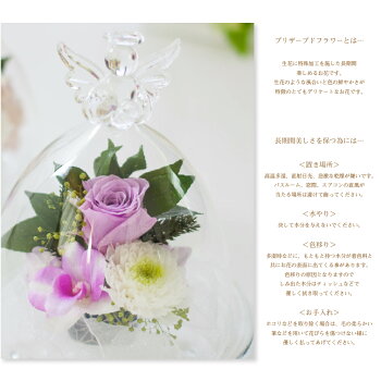 愛おしい人や大切なペットを慈しみ偲ぶ気持ちを天使がそっと届けますガラスの中には優しく淡い色合いのプリザーブドフラワーローズのアレンジが入っており、可愛らしさと上品さを兼ね備えた特別な一品です。