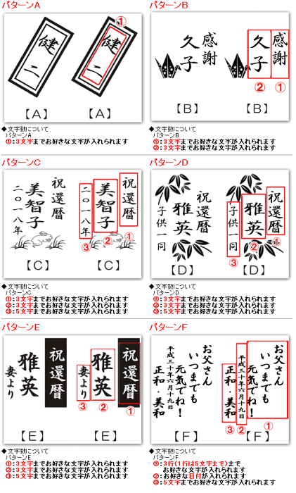 オリジナルメッセージ ご注文方法 1: 9種類(A〜 I )の文字入れパターンと字体(フォント)を選択 ⇒「買い物かごに入れる」 2: 「注文画面に進む」 3: 「簡単注文画面STEP1」 (注文者情報入力) 必要事項をご入力ください 4: 「簡単注文画面STEP3」 (お支払い方法・配送方法選択) 画面下のほうに「文字入れ内容記 入欄」がございます そちらに文字入れ内容をご記入ください。