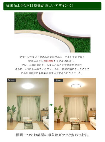 ■適応畳数〜12畳用■定格電圧100V(50/60Hz)■定格消費電力約52W■待機電力0.5W■光色電球色〜昼光色相当■器具光束5200lm■演色性80Ra■設計寿命40000時間■調光/調色/常夜灯10/11/2段階■タイマーおやすみタイマ・るすばん機能・点灯タイマー■セット内容LEDシーリングライト本体、取り付け用スペーサー(角)、取り付け用スペーサー(丸)、リモコン、リモコンホルダー、単3形乾電池×2本、ネジ×2本、取扱説明書■材質ポリプロピレン、鋼板、難燃ポリカ■商品サイズ(cm)直径約56.5×高さ約9.3■重量約1.9kg■カラーウォールナット・ナチュラル本格木調でお部屋を演出、リビングや寝室に最適なLEDシーリングライトです。